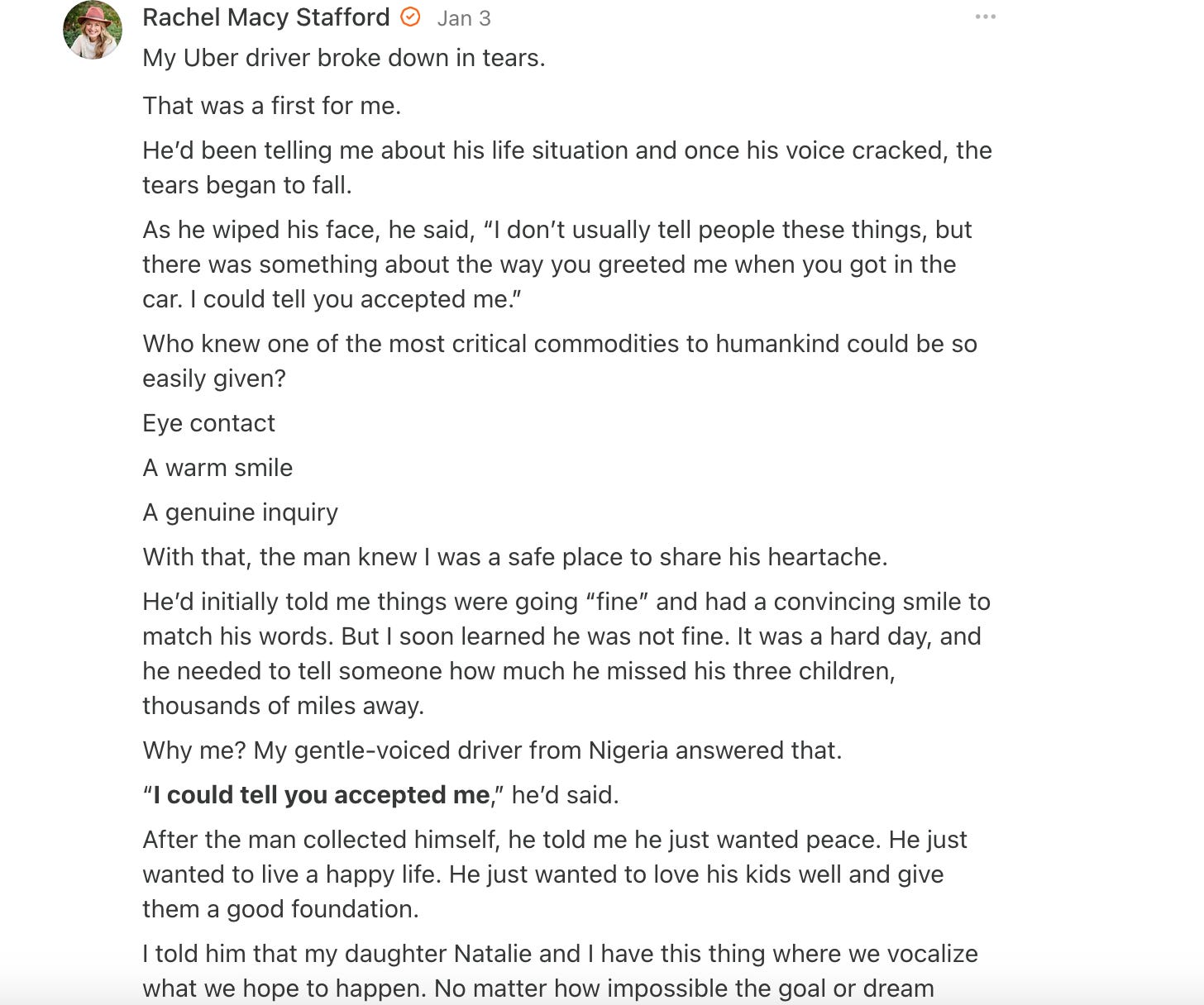 One of the most beautiful storytellers on Notes is Rachel Macy Stafford of Rachel's Treehouse. Her Notes are often quite long (I’ve included an excerpt of one here), are always beautifully written, and are a welcome respite of kindness and hope.
