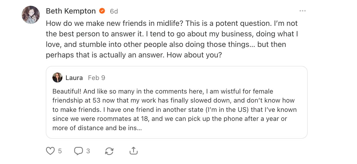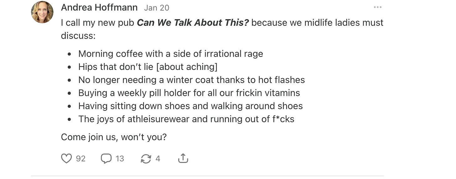If you’d like to learn more from midlife Substackers about their Notes strategy, join us for tomorrow’s (February 21st at 1 p.m. ET) Show and Tell Midstack Meetup. In our Zoom call, several Midstackers will share their journeys on Substack, including how they’re using Notes to grow their audience.