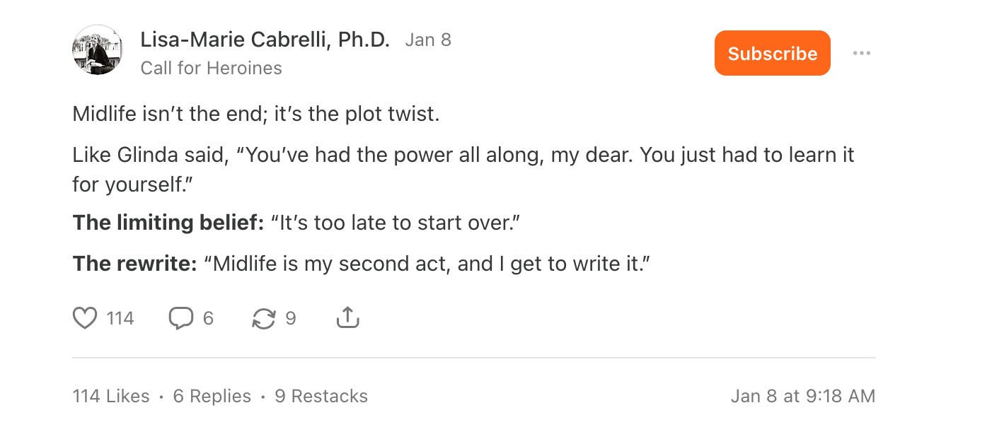 Another midlife Substacker whose Notes I love is Lisa-Marie Cabrelli, Ph.D. of Call for Heroines. She has truly built a community on Notes, engages regularly with her own posts and others’, and regularly recommends other writers and posters.